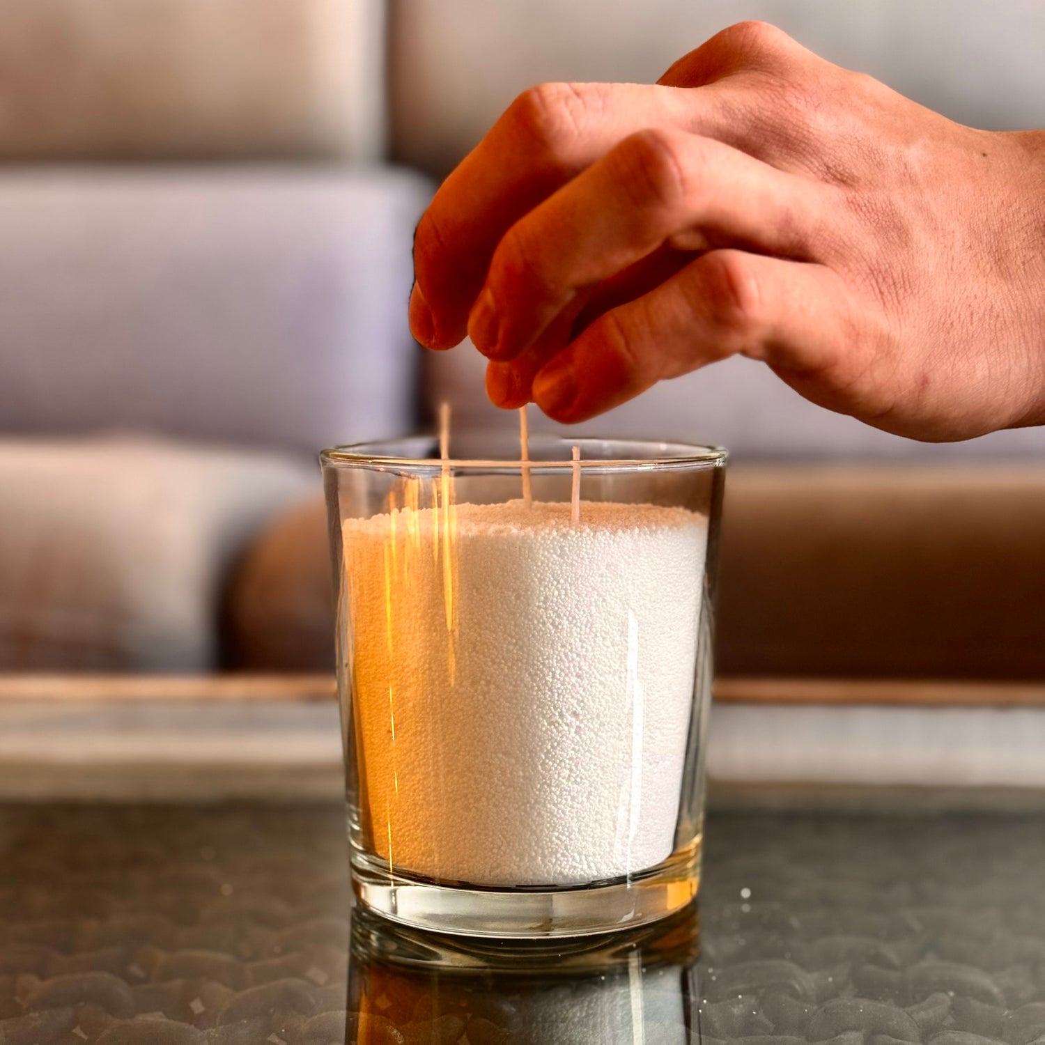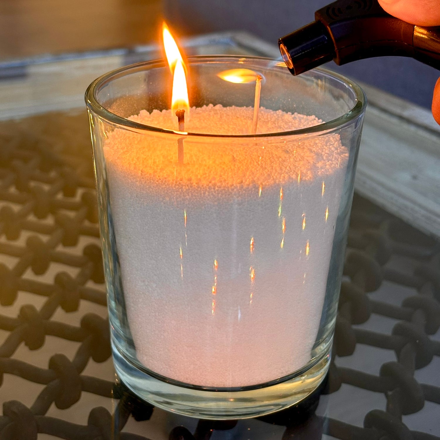 Gracias a su composición en forma de arena, la vela se apaga sola si se vuelca, evitando accidentes y haciendo que sea perfecta para hogares con niños o mascotas.
