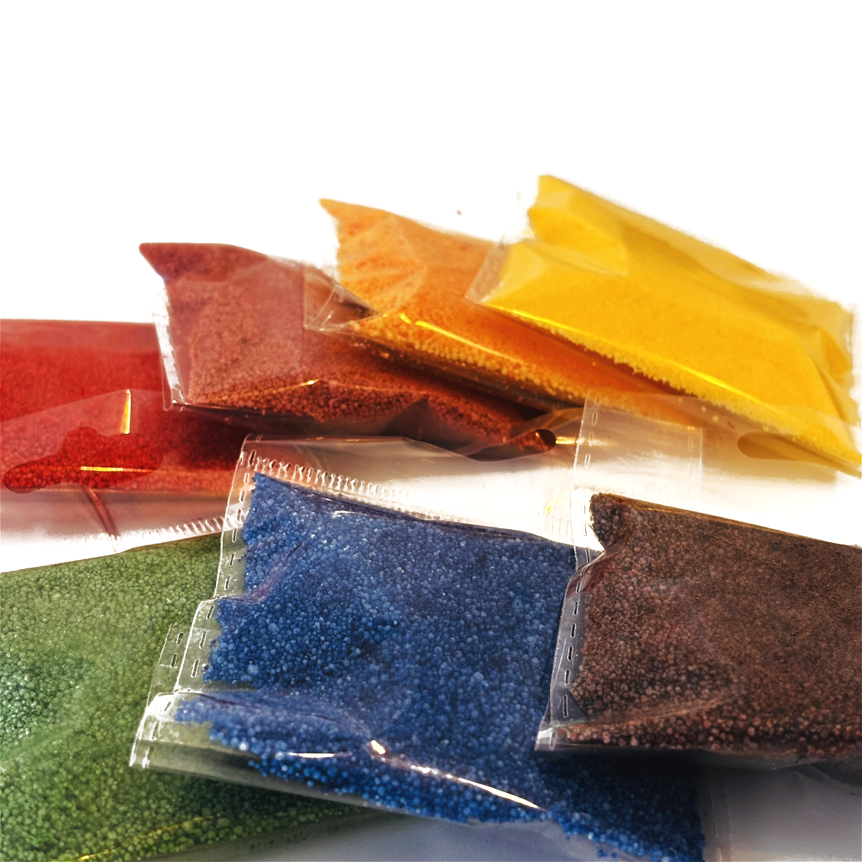 El kit trae todo lo necesario para crear tus primeras velas de arena: arena de colores, mechas, e instrumentos varios.